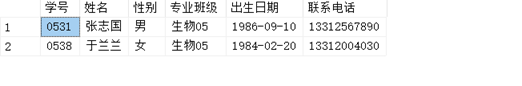 INSERT [dbo].[学生表] ([学号], [姓名], [性别], [专业班级], [出生日期], [联系电话]) VALUES (N'0531 ', N'张志国 ', N'男', N'生物05 ', CAST(0x0A110B00 AS Date), N'13312567890 ') | |