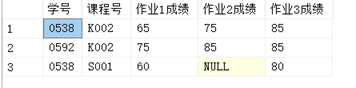 INSERT [dbo].[学生作业表] ([课程号], [学号], [作业1成绩], [作业2成绩], [作业3成绩]) VALUES (N'S001 ', N'0538 ', 60, NULL, 80) | |