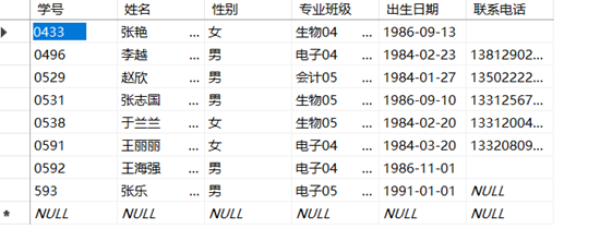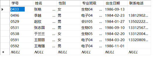 INSERT [dbo].[学生表] ([学号], [姓名], [性别], [专业班级], [出生日期], [联系电话]) VALUES (N'0433 ', N'张艳 ', N'女', N'生物04 ', CAST(0x0D110B00 AS Date), N' ') | |